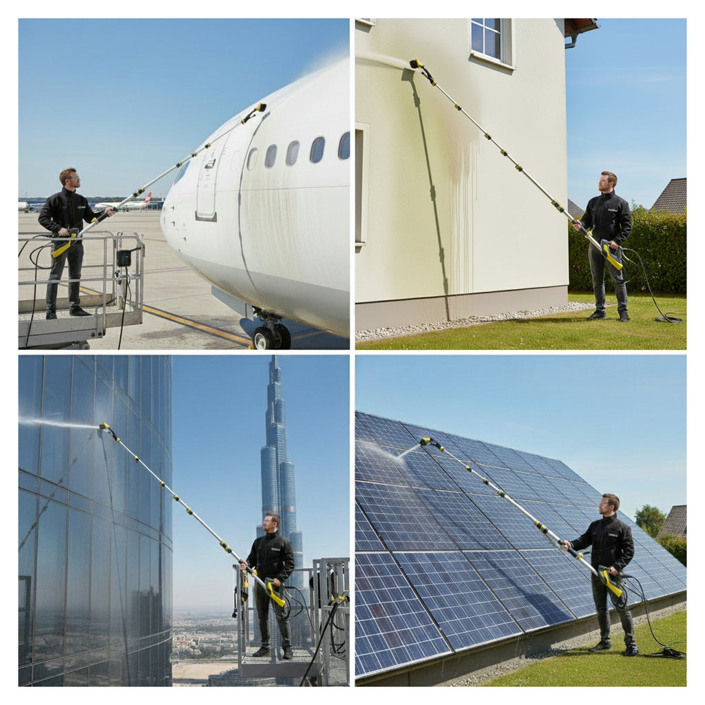 - Ideala pentru curatarea acoperisurilor, fatadelor, corniselor, jgheaburilor, panourilor solare, ferestrelor si peretilor halelor, fara a fi nevoie de o scara.
