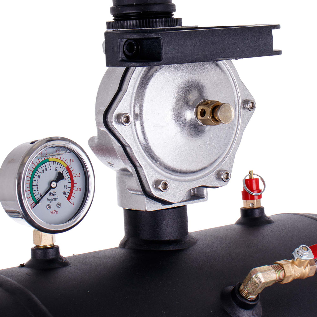 Pe rezervor este montat un manometru care indica presiunea curenta a aerului pompat.